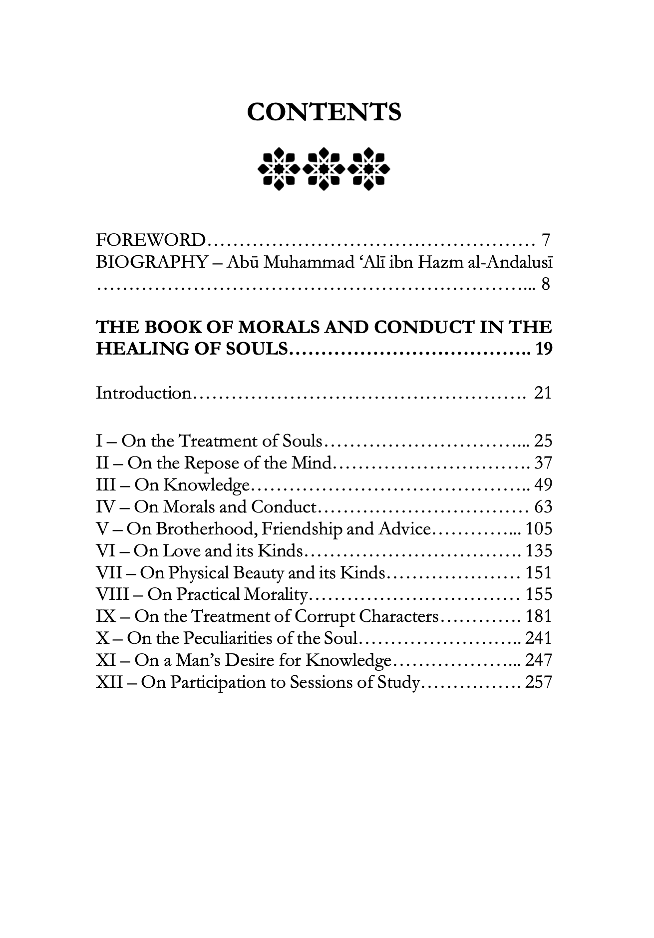 This concise ethical treatise declares as its aim the treatment of the soul’s afflictions and its purification from corruption, through the articulation of an ideal code of conduct grounded in a set of positive values and virtues — chief among them justice, intelligence, courage, and generosity. The cultivation of these virtues leads to a life of moral integrity and to true success, both in this world and in the Hereafter. Drawing upon the author’s long and often arduous personal experience — marked by both the heights of eminence and the collapse of his Andalusi homeland — the work calls upon its readers to adhere to a higher moral order, defined by the precepts of the religious Law and sound reason, as a means of navigating the trials and tribulations of this earthly life.